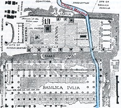 clear that the Cloaca still performs some drainage function. The ditch was open for many centuries, but was covered over at least by the time of the censorship of Cato the Elder (184 BCE), whose restorative work on the Cloaca earned him a statue in the Temple of of Salus (Public Welfare). As sanitation devices, Lanciani says, the sewers of Rome were much over-rated, since they did not appear to service private houses and since they dumped raw sewage as well as rain water into the Tiber River. But the Cloaca Maxima has a special importance in the history of the City, since it was only after the Claca drained the swampy Forum area that it could be used as a civic center. This project is traditionally dated to Tarquin the Proud (late 6th century BCE). |
