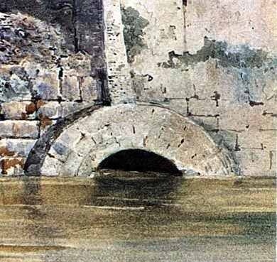 This detail from the painting shows the Cloaca more clearly: The modern embankment encloses it considerably, but it is
